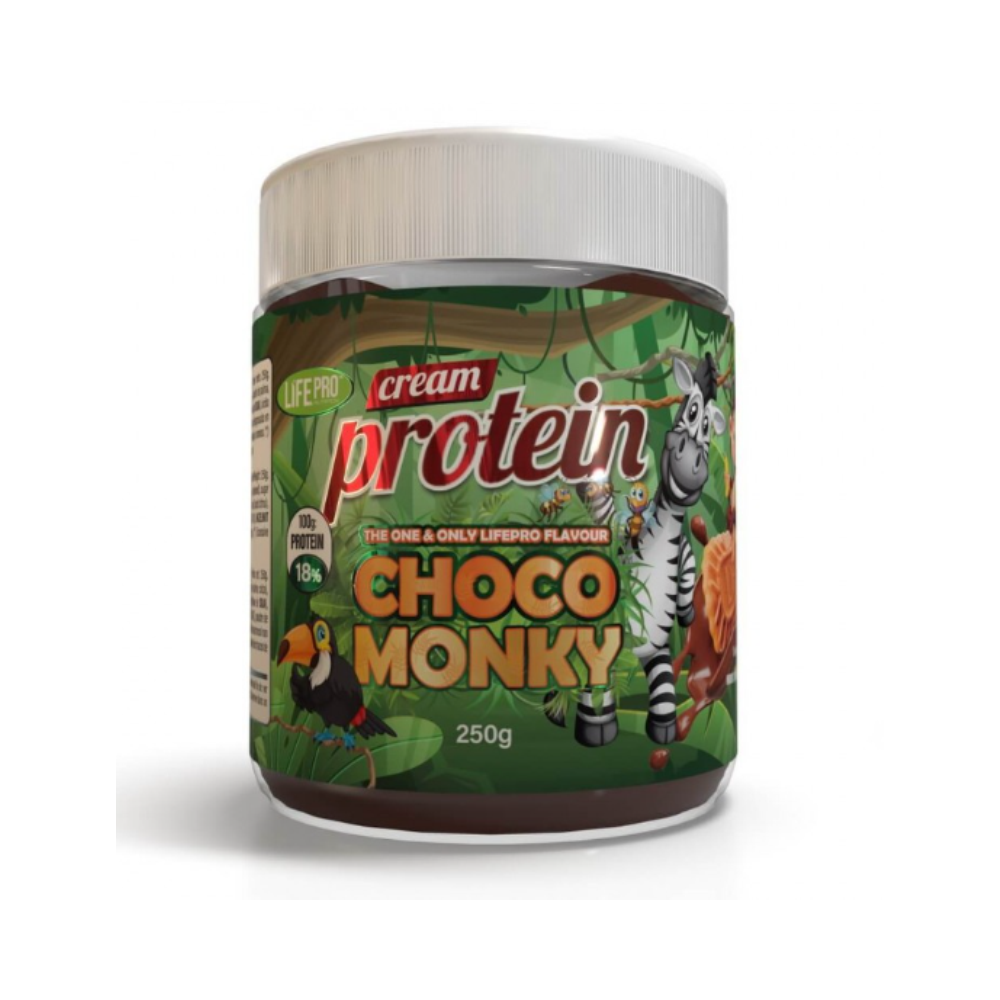 La Life Pro Fit Food Protein Cream Choco Monky 250g es una deliciosa crema de untar que combina el sabor de la clásica tableta de chocolate de la infancia con los beneficios de una crema proteica.